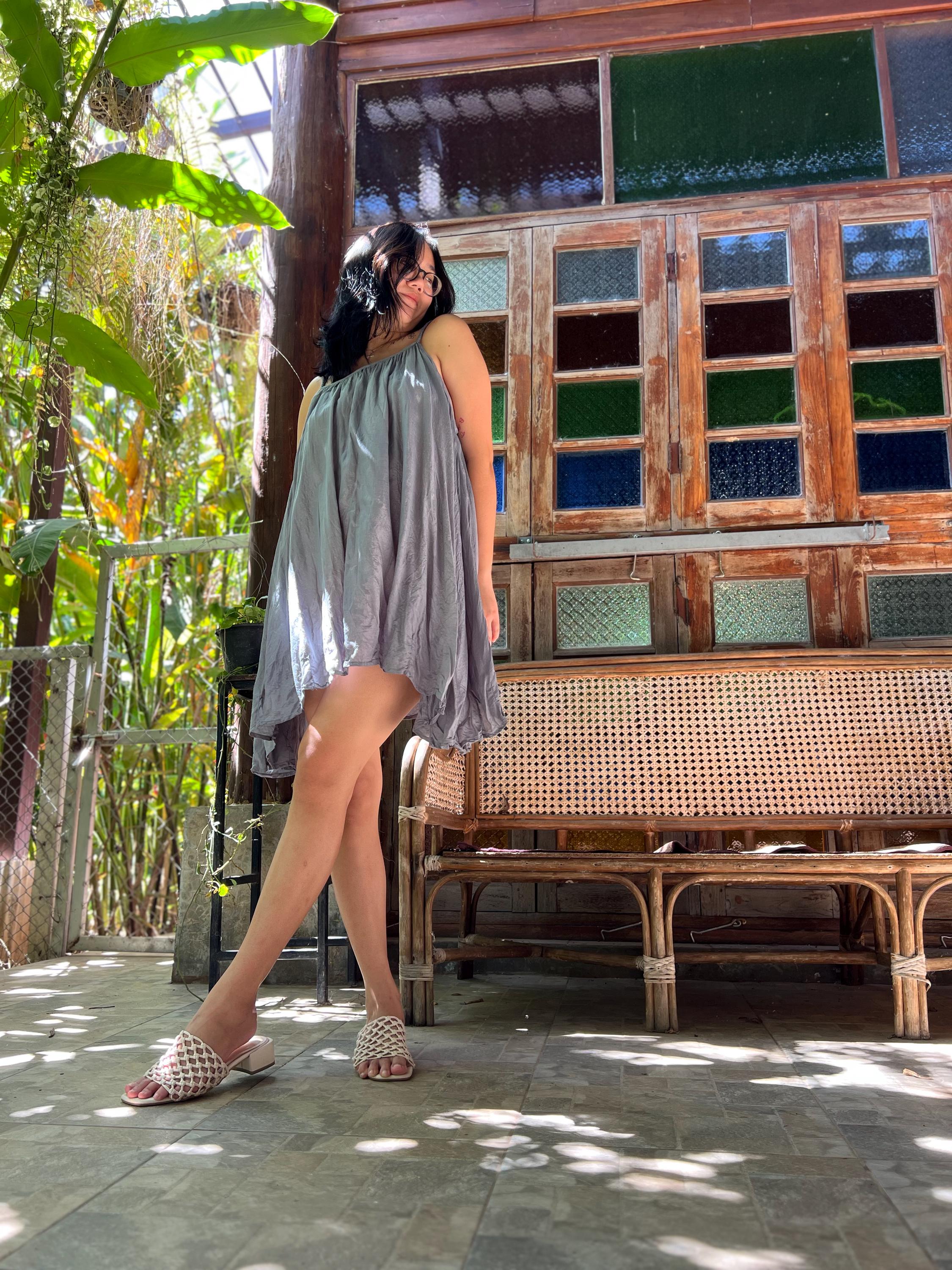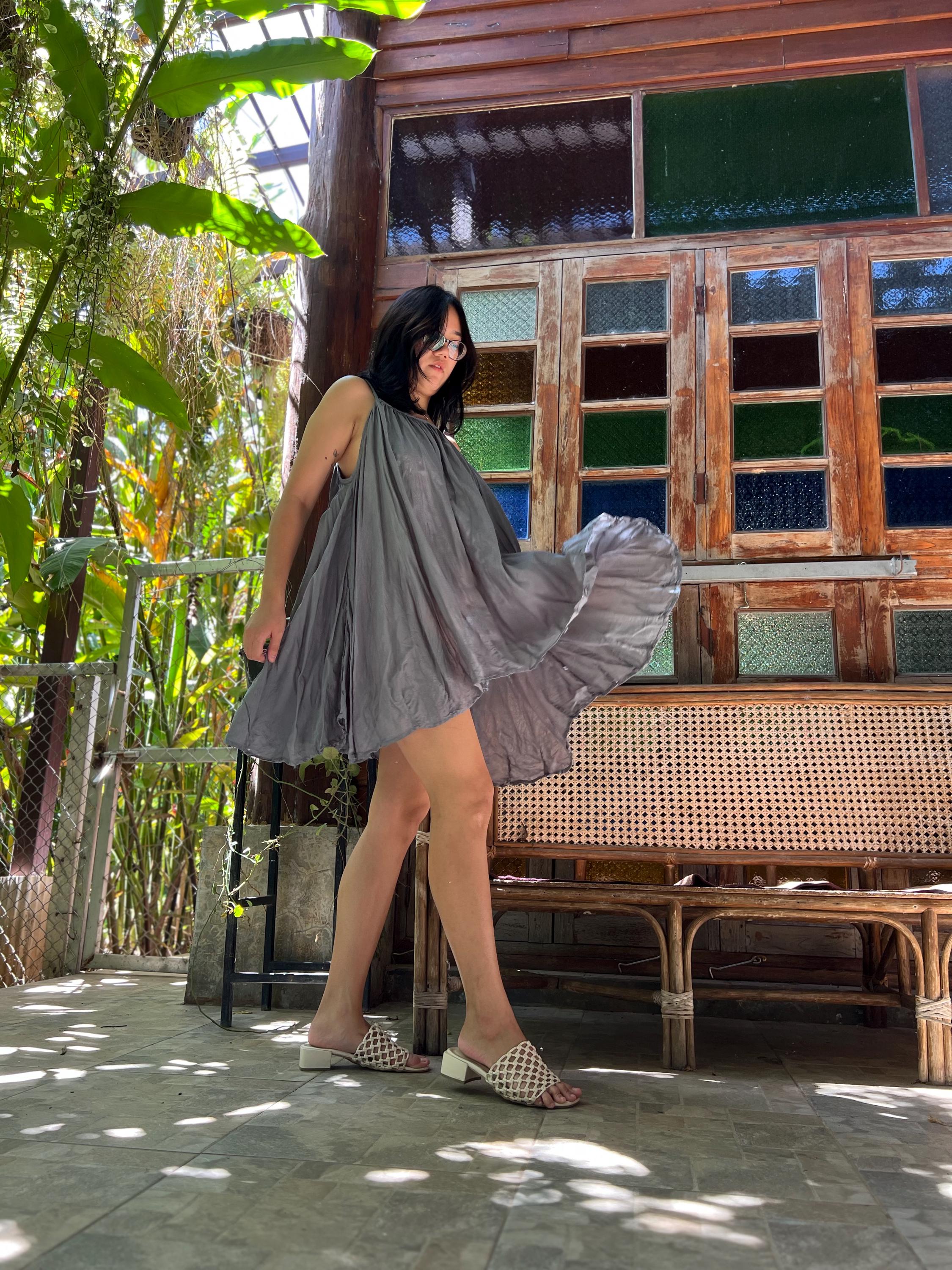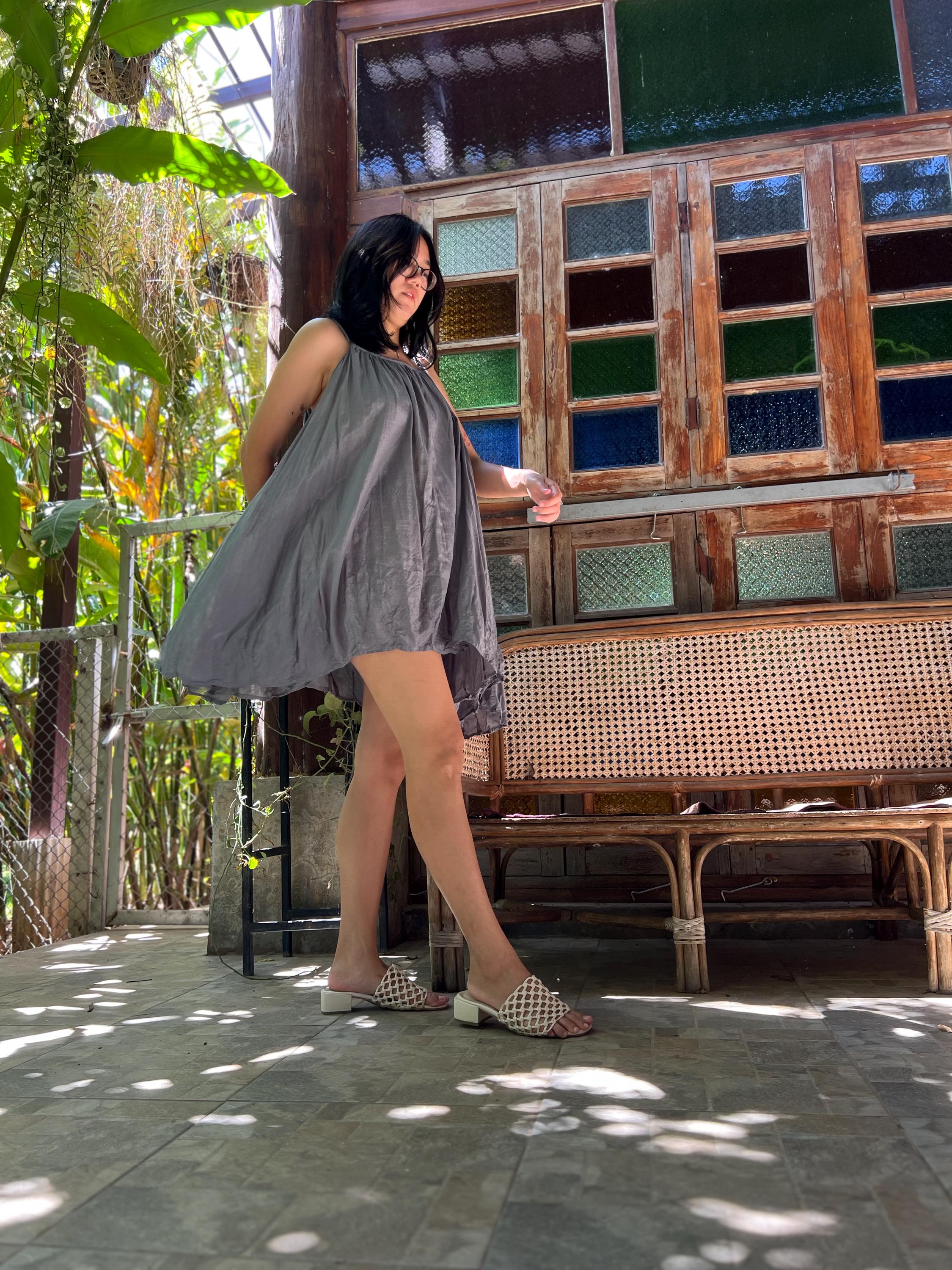 Balloon shape with pleats all around on th bottom hem. Braded spaghetti strap. Loose fit. Very very full, used 4 meters of fabric.