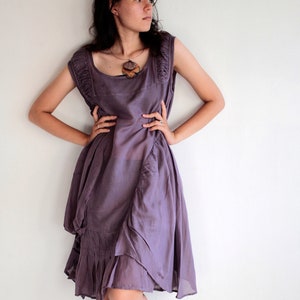 The main piece is an A shape tunic with wide neckline. 3/4 sleeve with smock hem. Gathered on the side for drapes. There is a string go all the way from shoulder to the side and side clasp for you to dress it up your own funky way. There is a wide bloodied on the back. A piece of layer that can be worn in the front or back (see picture 2 and 3 for comparison)