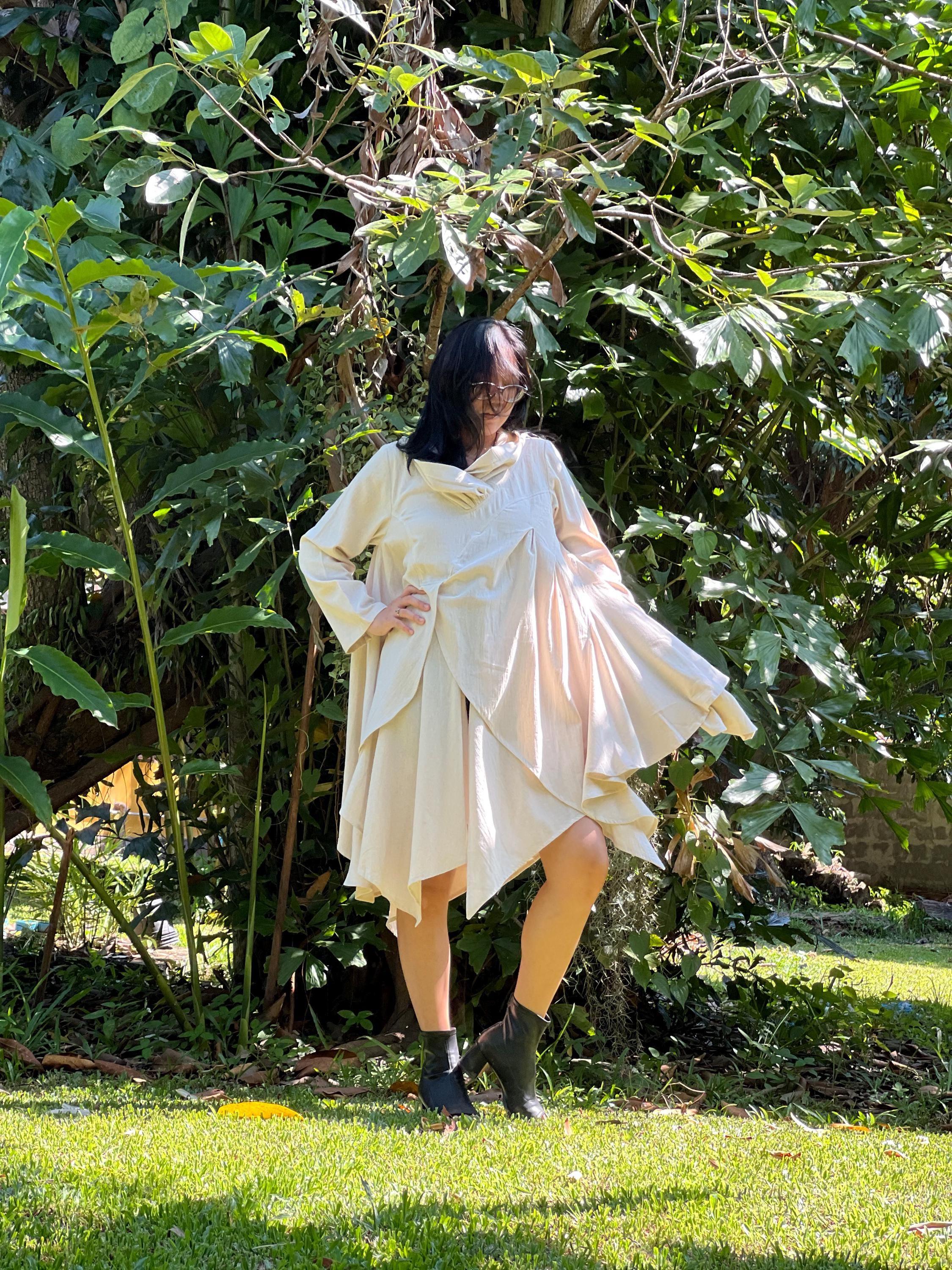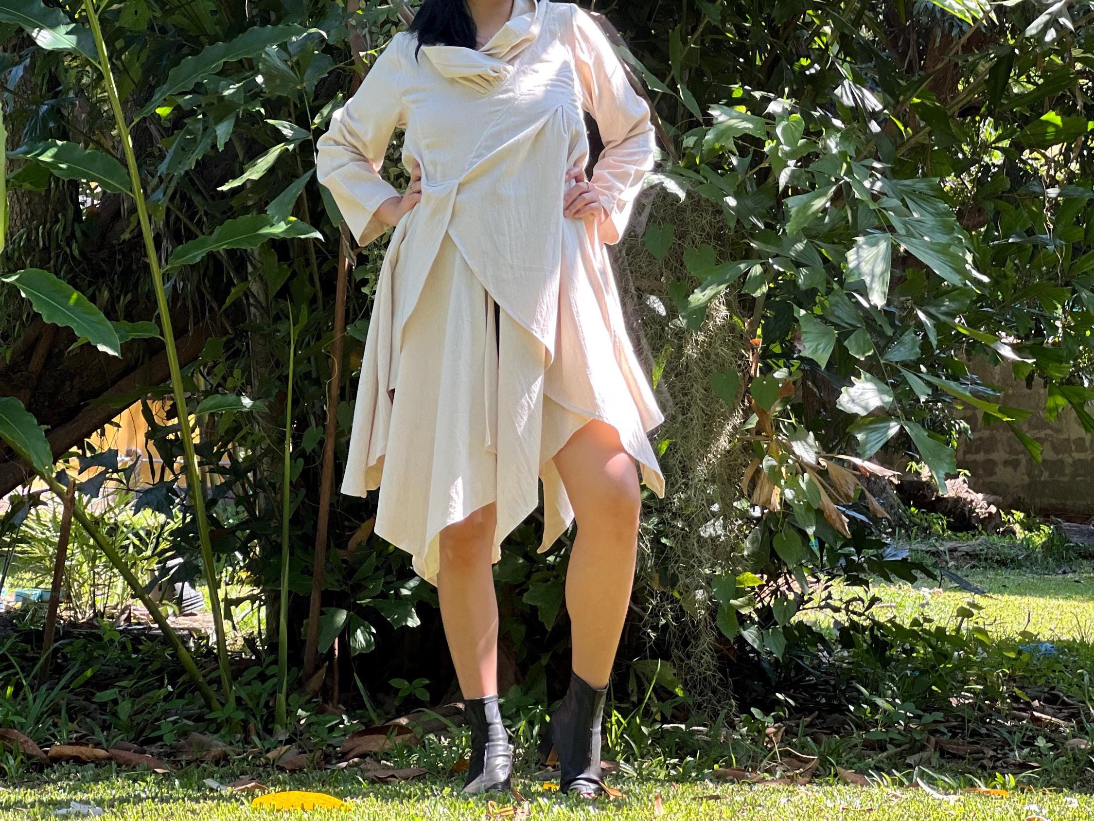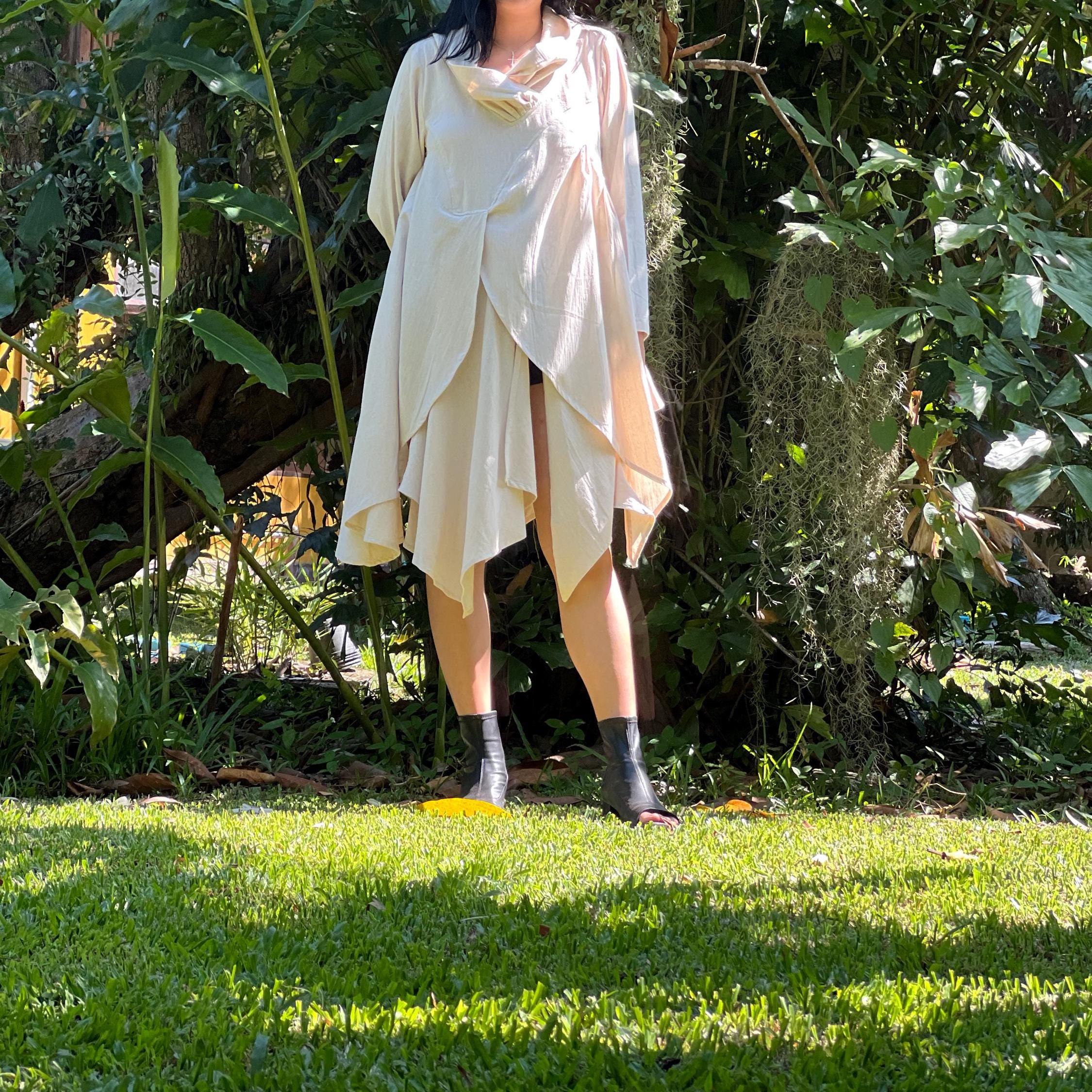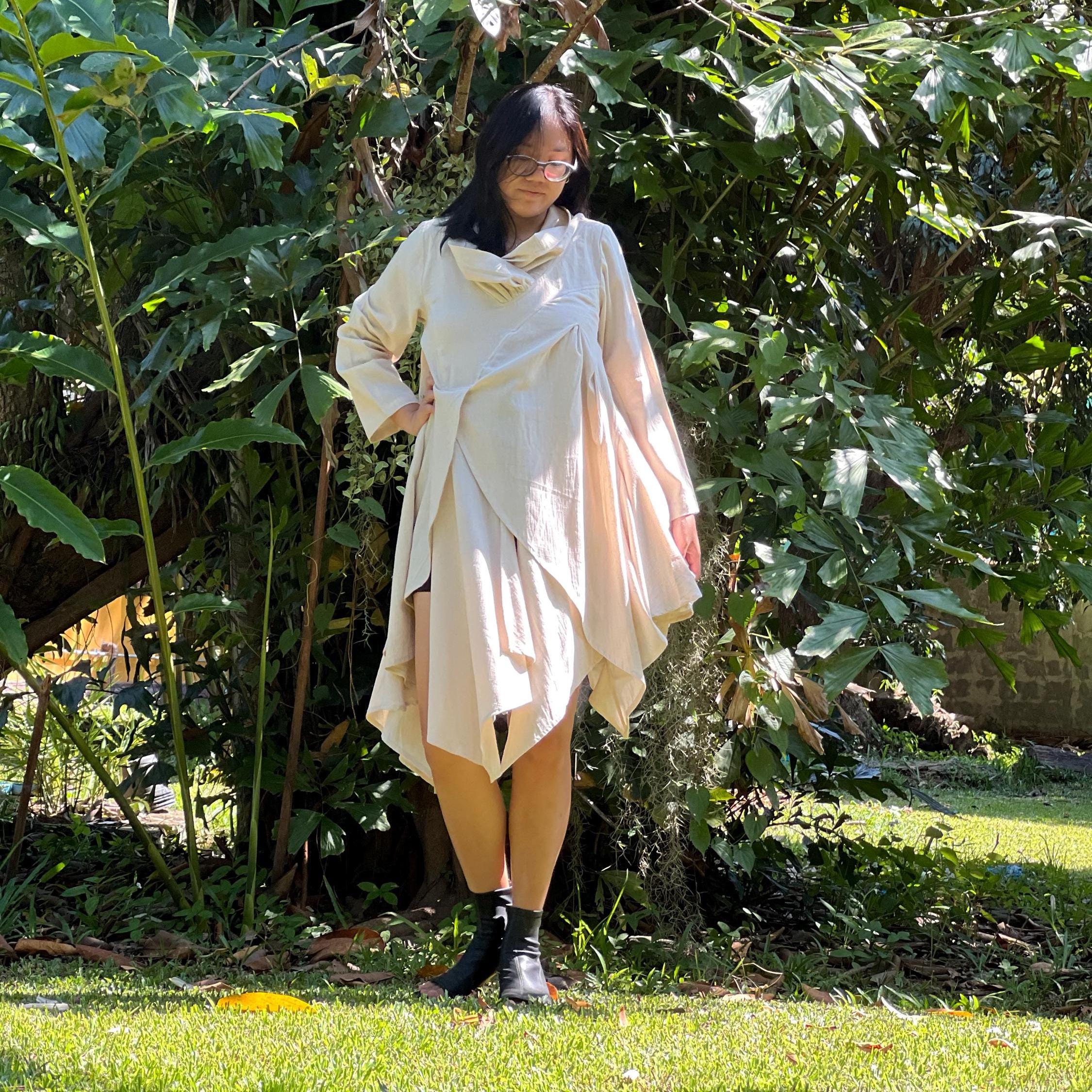 Asymmetric design with many detail. Overlap neck piece. Long sleeve. The bottom part of the tunic is done in a patching style. with 5 asymmetrical pieces all in different length. It flows, swing and sway while you walk. The body of the dress is in a wide A shape.