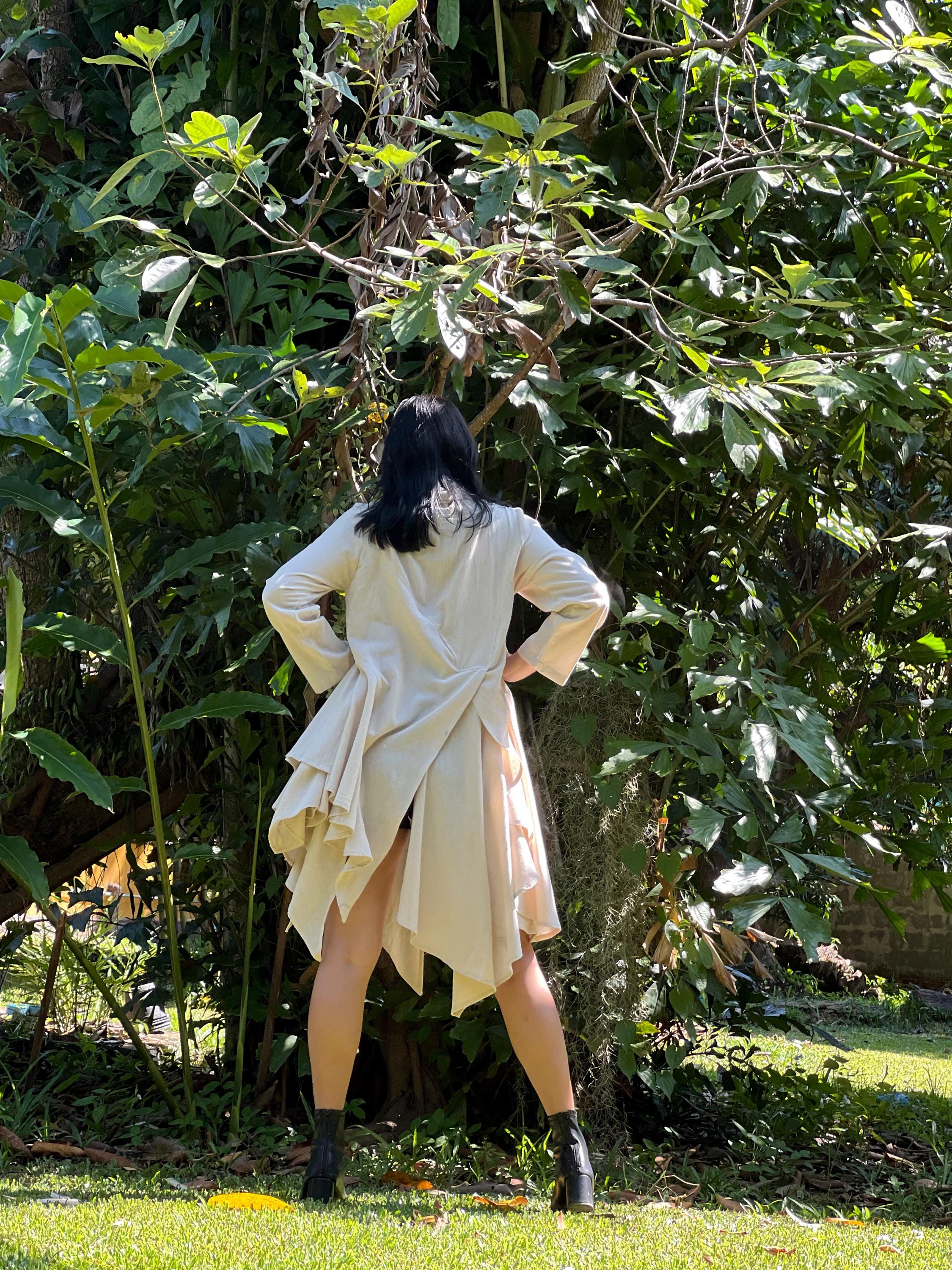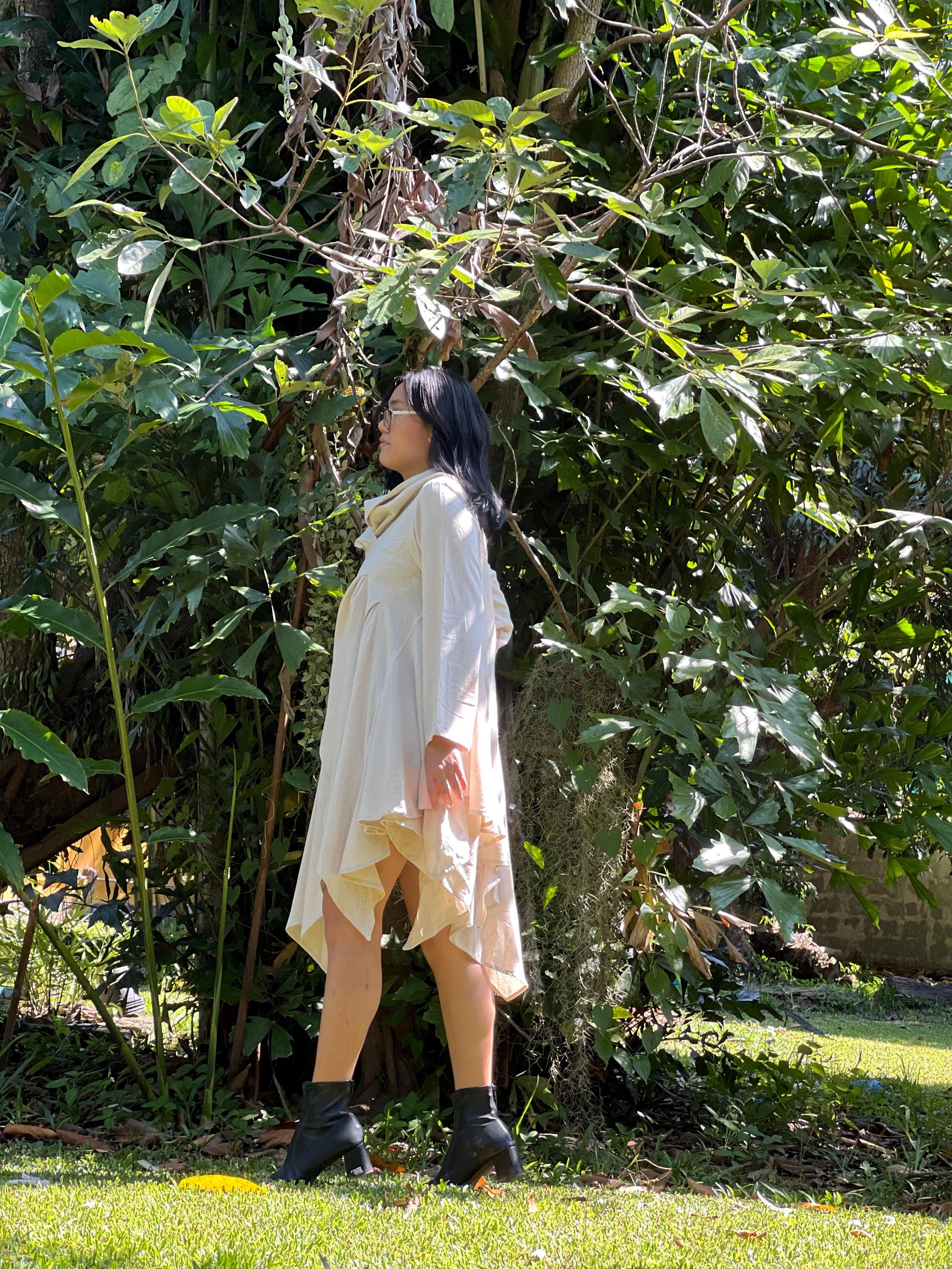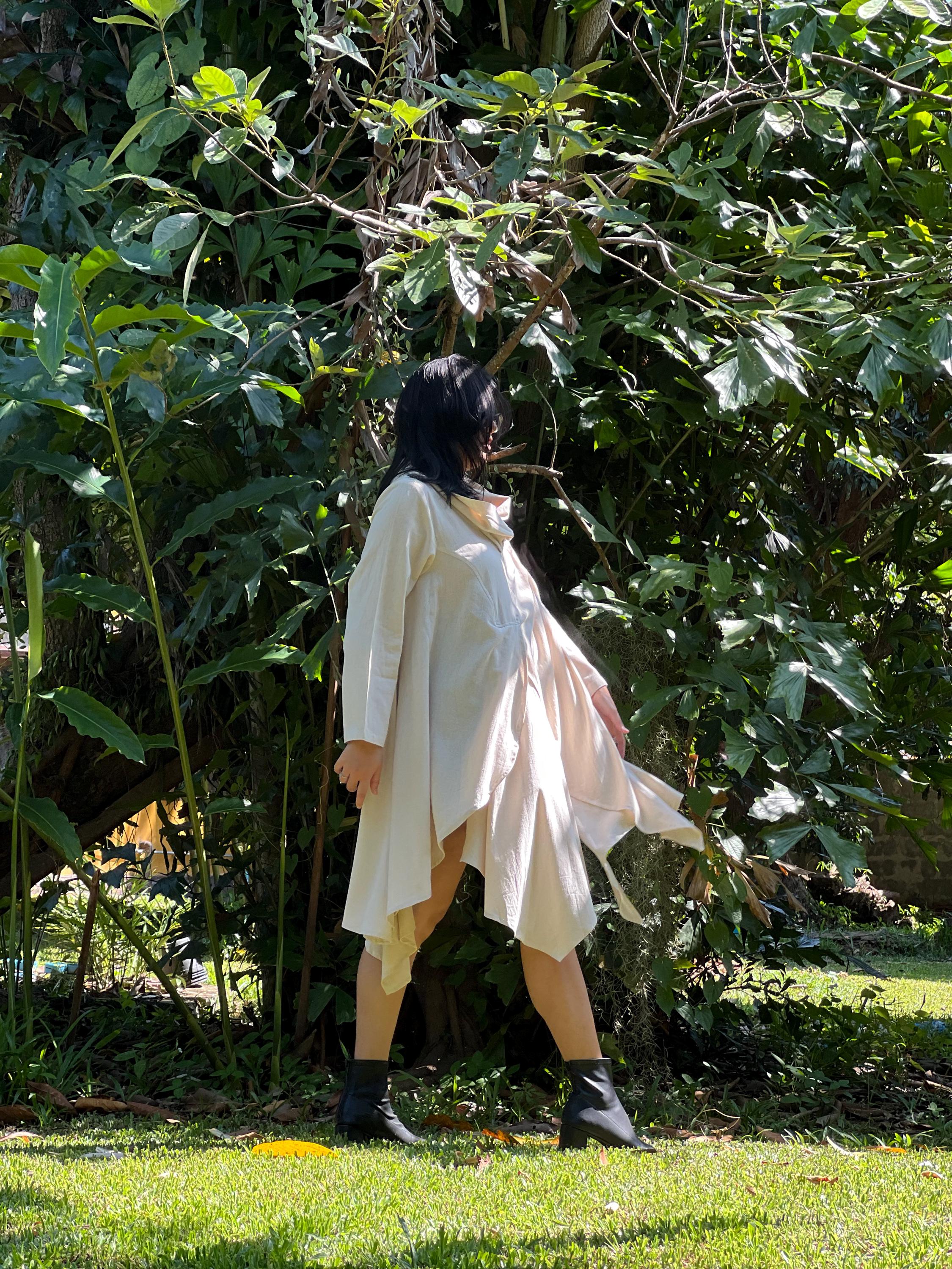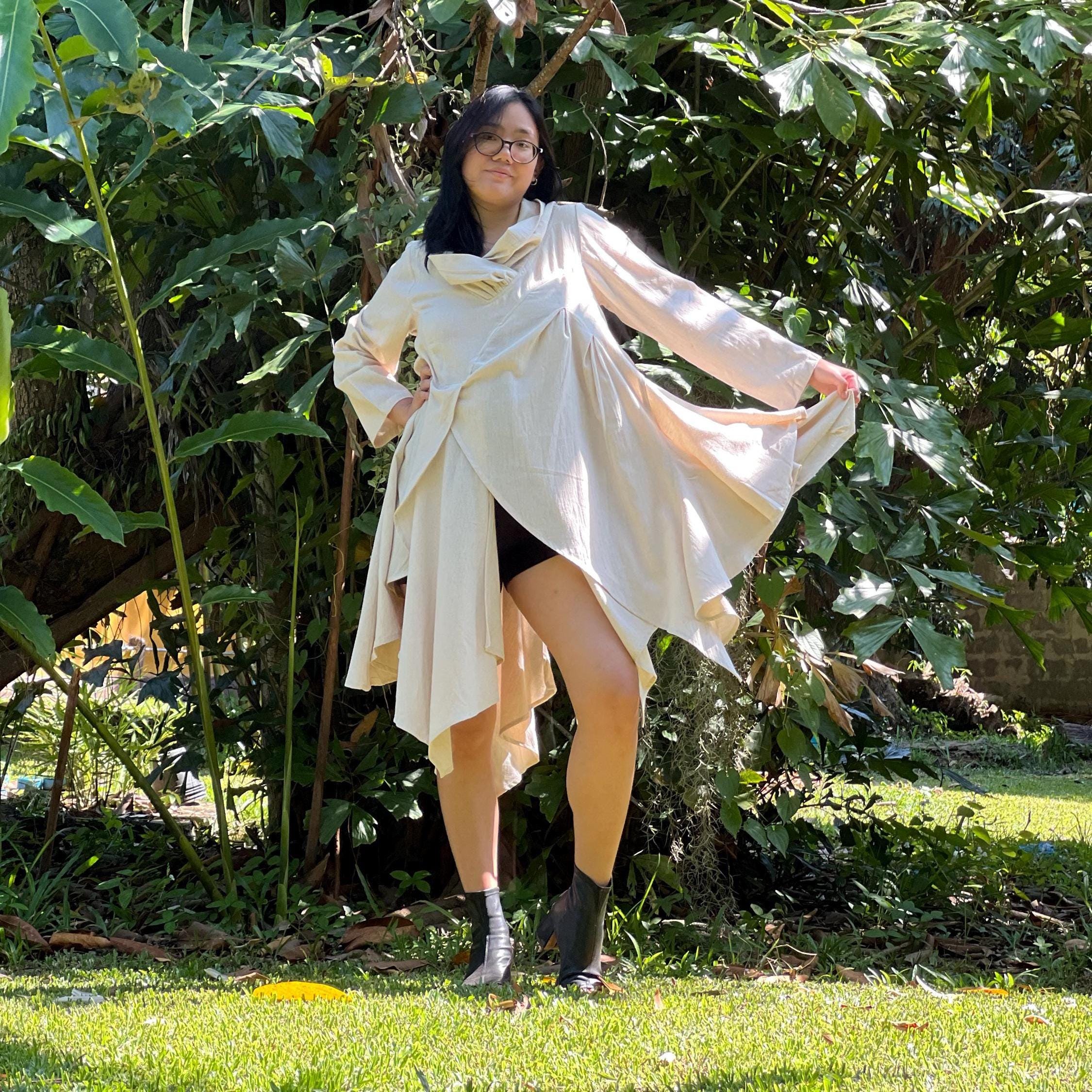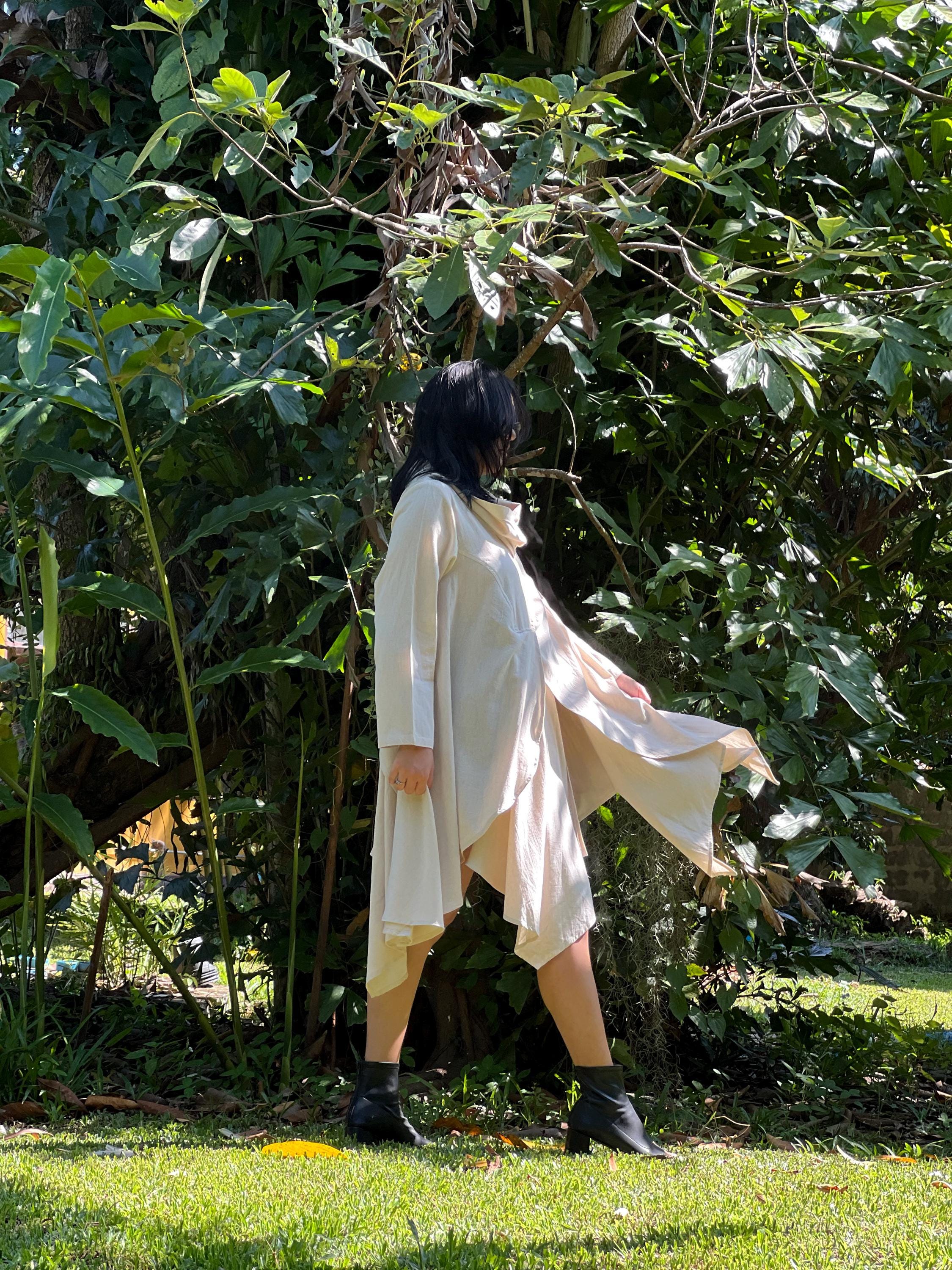 Asymmetric design with many detail. Overlap neck piece. Long sleeve. The bottom part of the tunic is done in a patching style. with 5 asymmetrical pieces all in different length. It flows, swing and sway while you walk. The body of the dress is in a wide A shape.