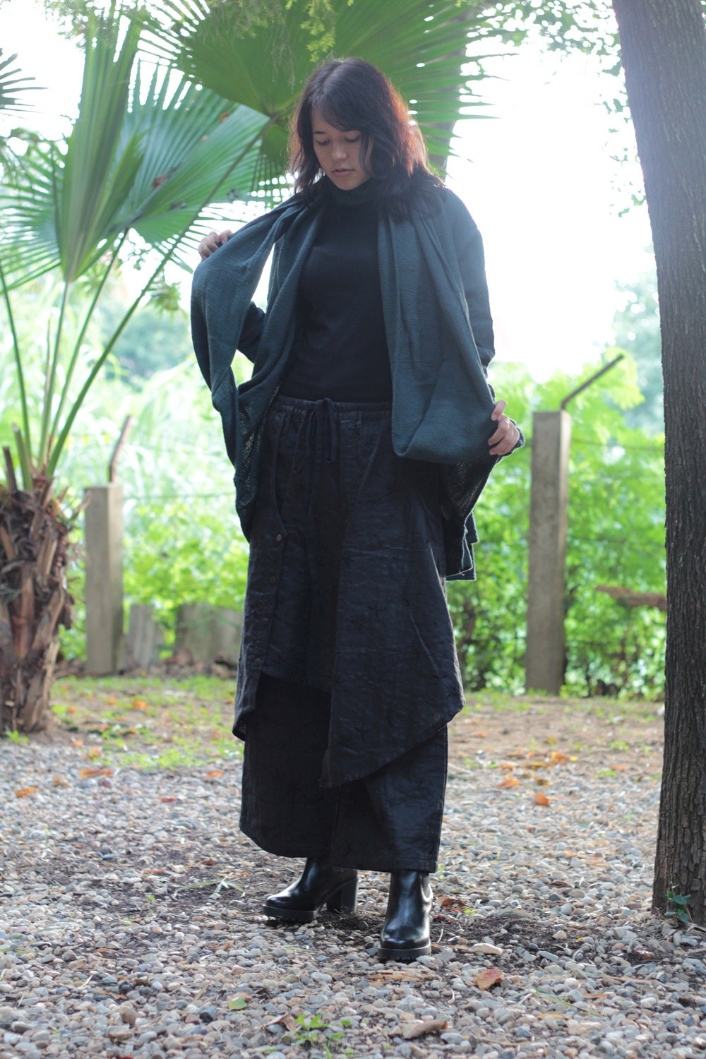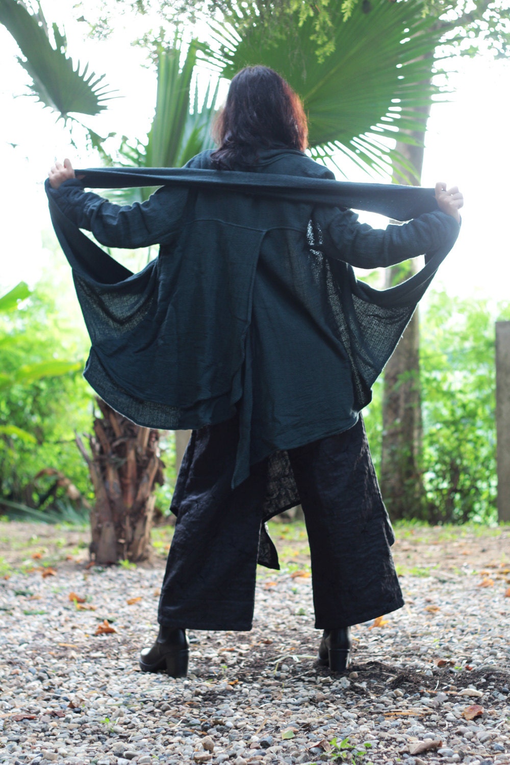 Long sleeve with gathered on the bottom part for easy to pull the sleeves up. Open front blazer style. Asymmetrical length on the back part.