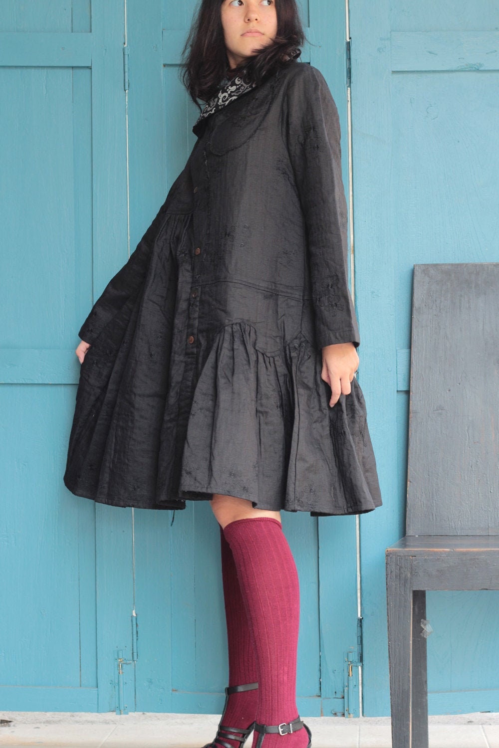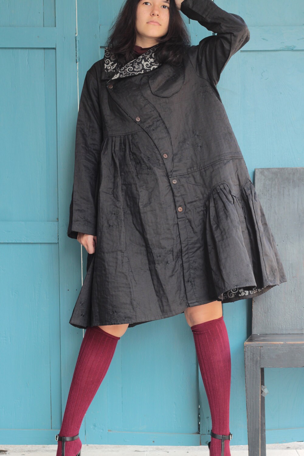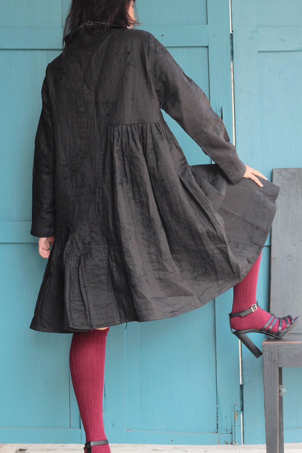 100% linen winter dress Knee length dress two Layers hand stitches linen one size 429