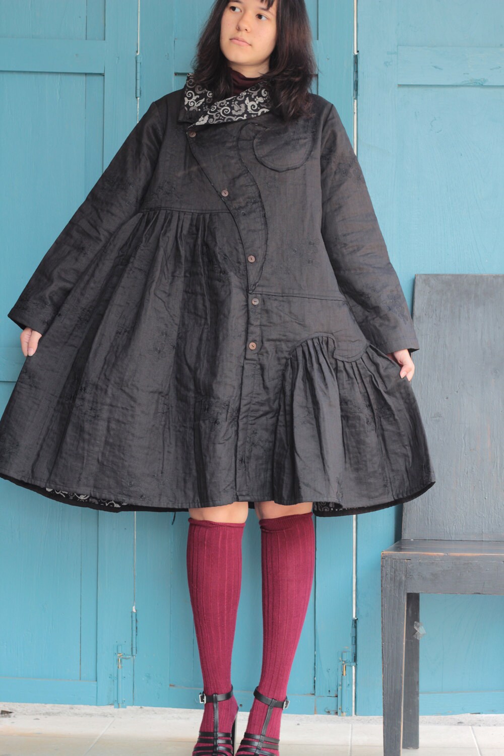 Funky creative winter jacket. Many details around neck and cuffs.