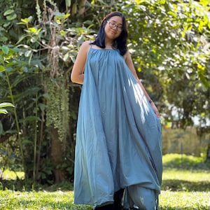 Round neck. with loose pleated detail on one shoulder. 2 layers of fabric with asymmetrical detail. Gathered in front and back in tiny pleats to create volume and flow of the dress. Long slid on the left side with tie. You can wrap and tie the tie around to the other side and get more fitted look. Flowy asymmetric lenght..