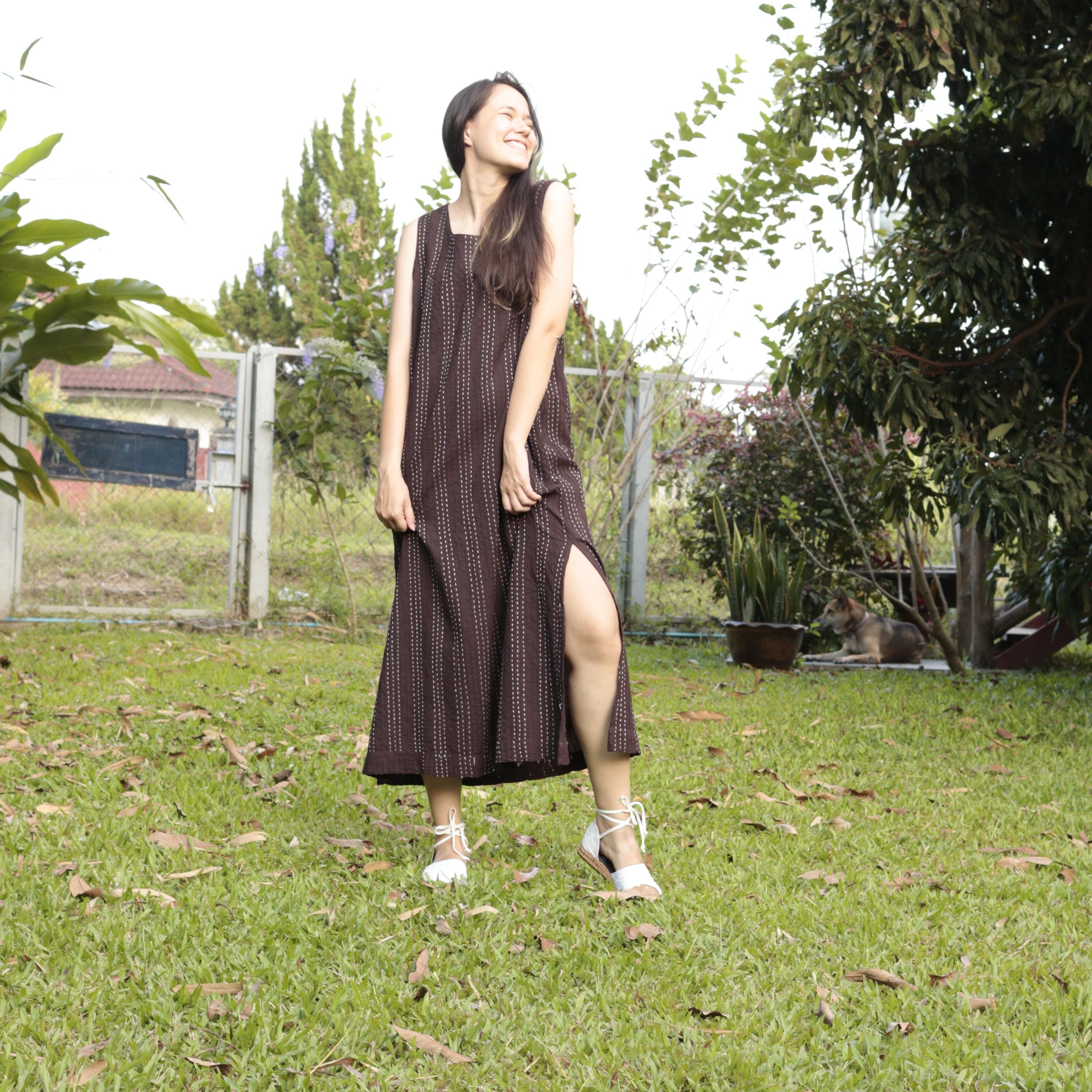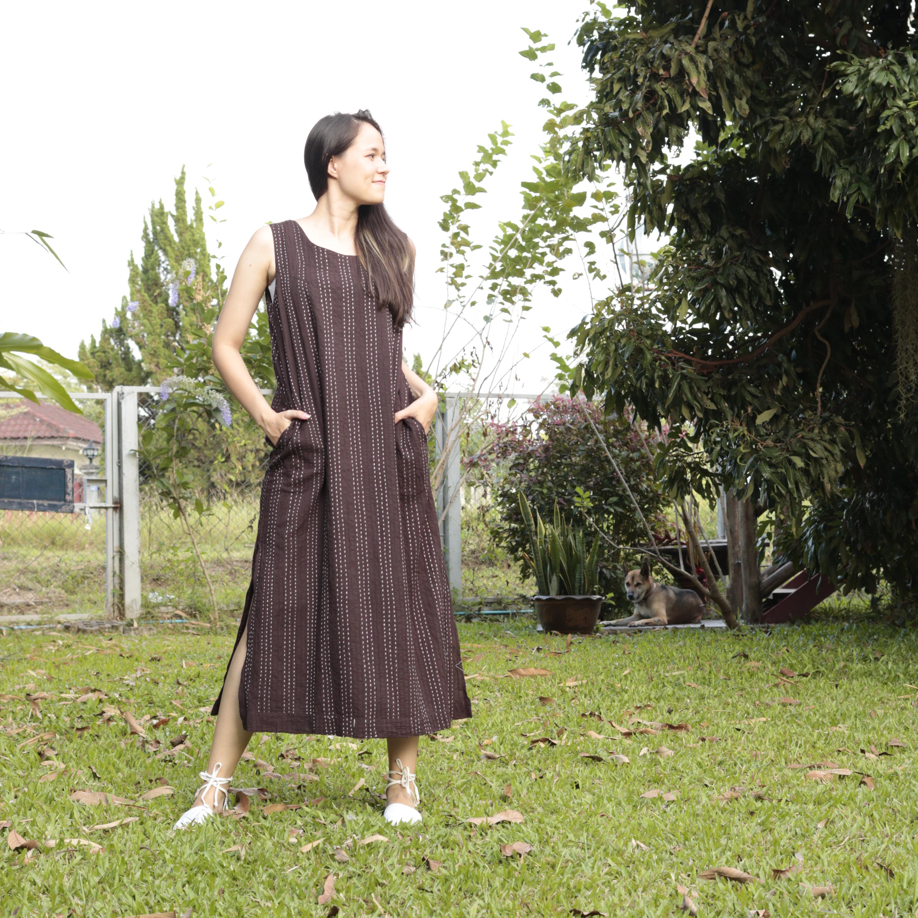 A beautifully made cotton dress. Delicate work on pleated detail with contrast color stitching.