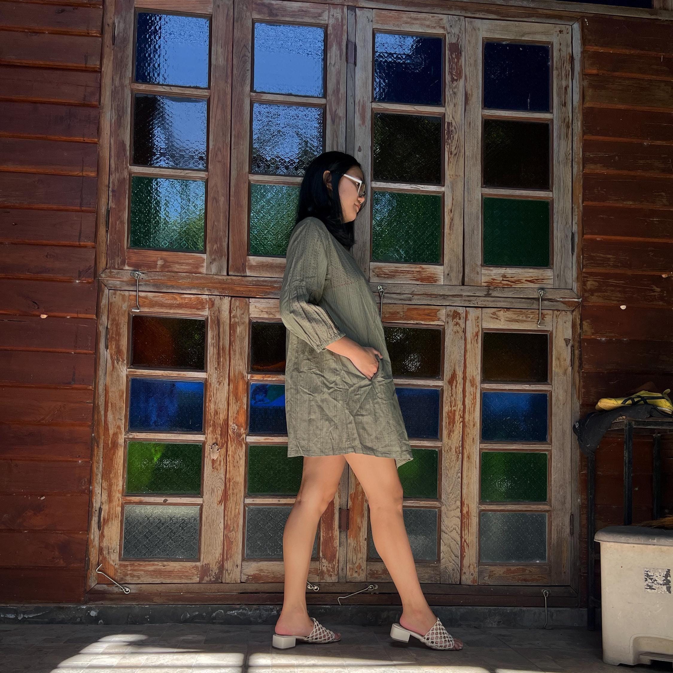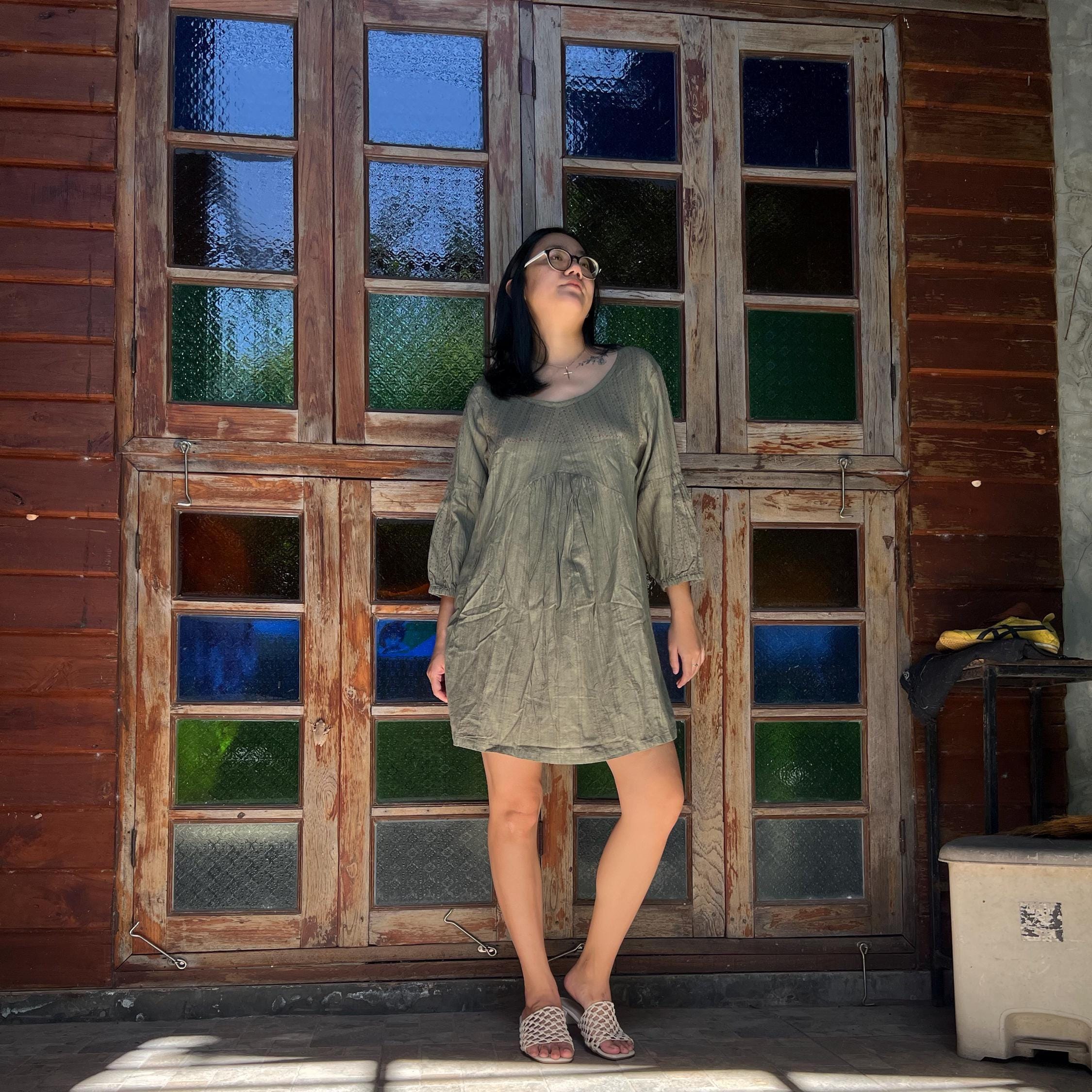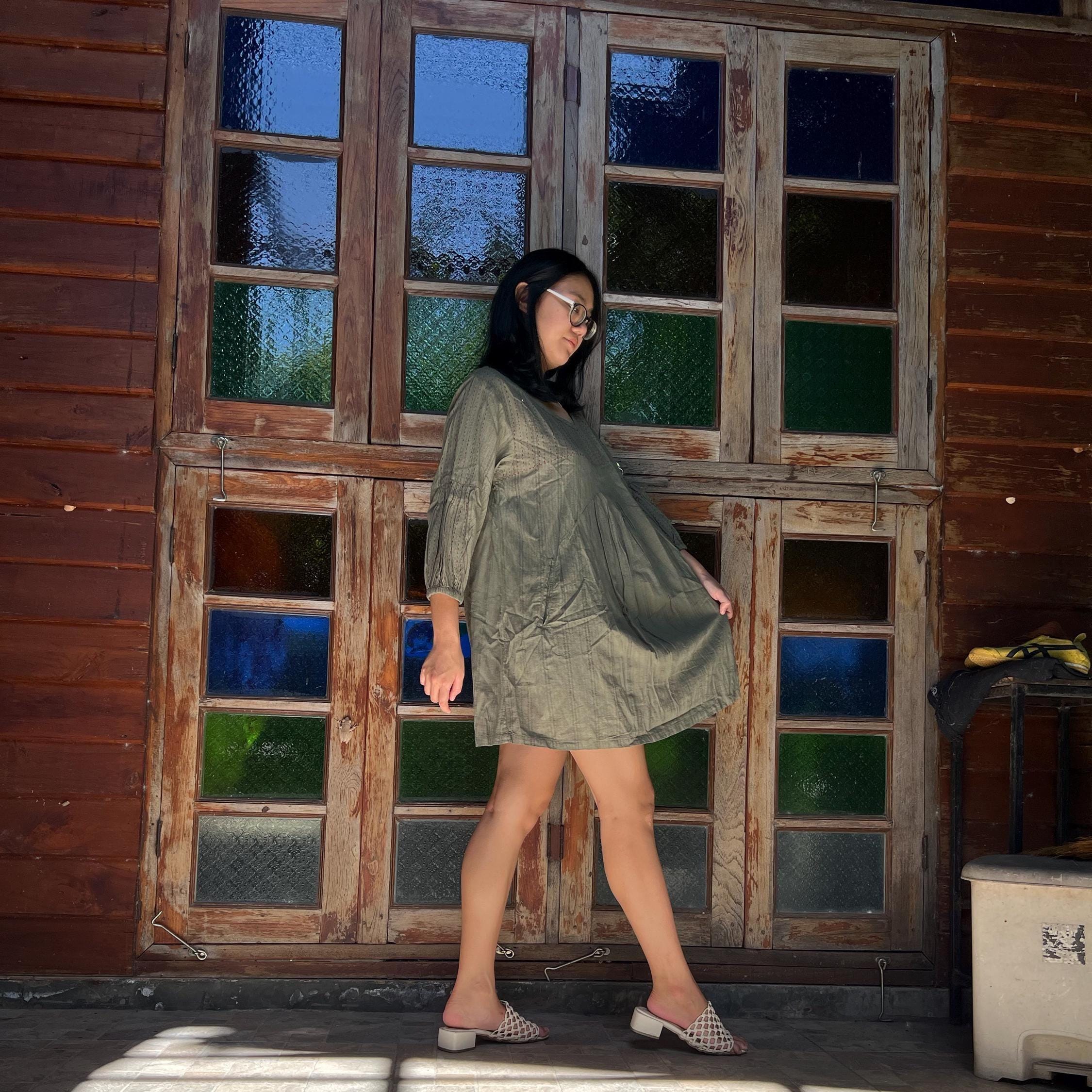 Round neck. A shape body part with gathers empire waist style. 2 front pockets. The pattern of the dress is simple yet very flattering.