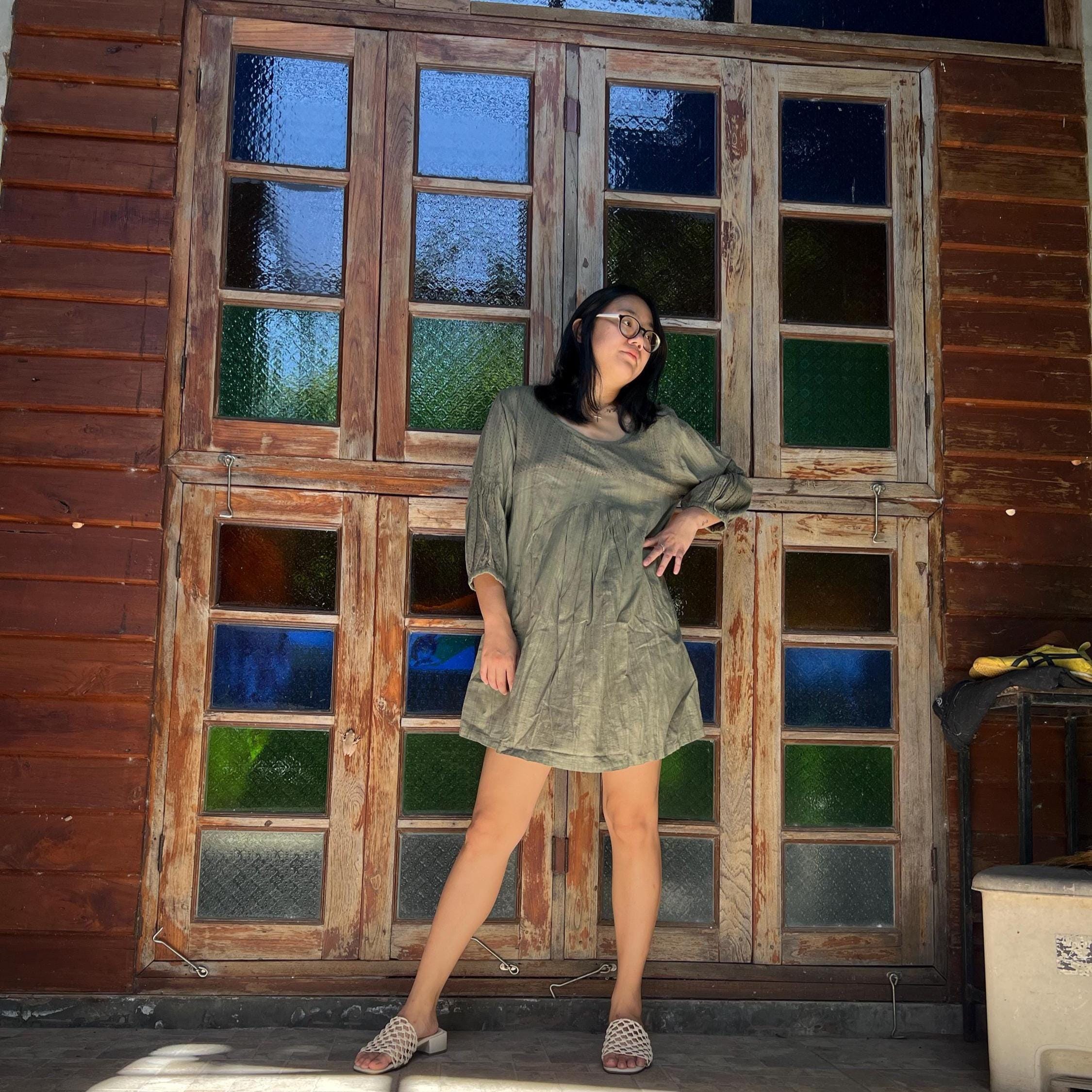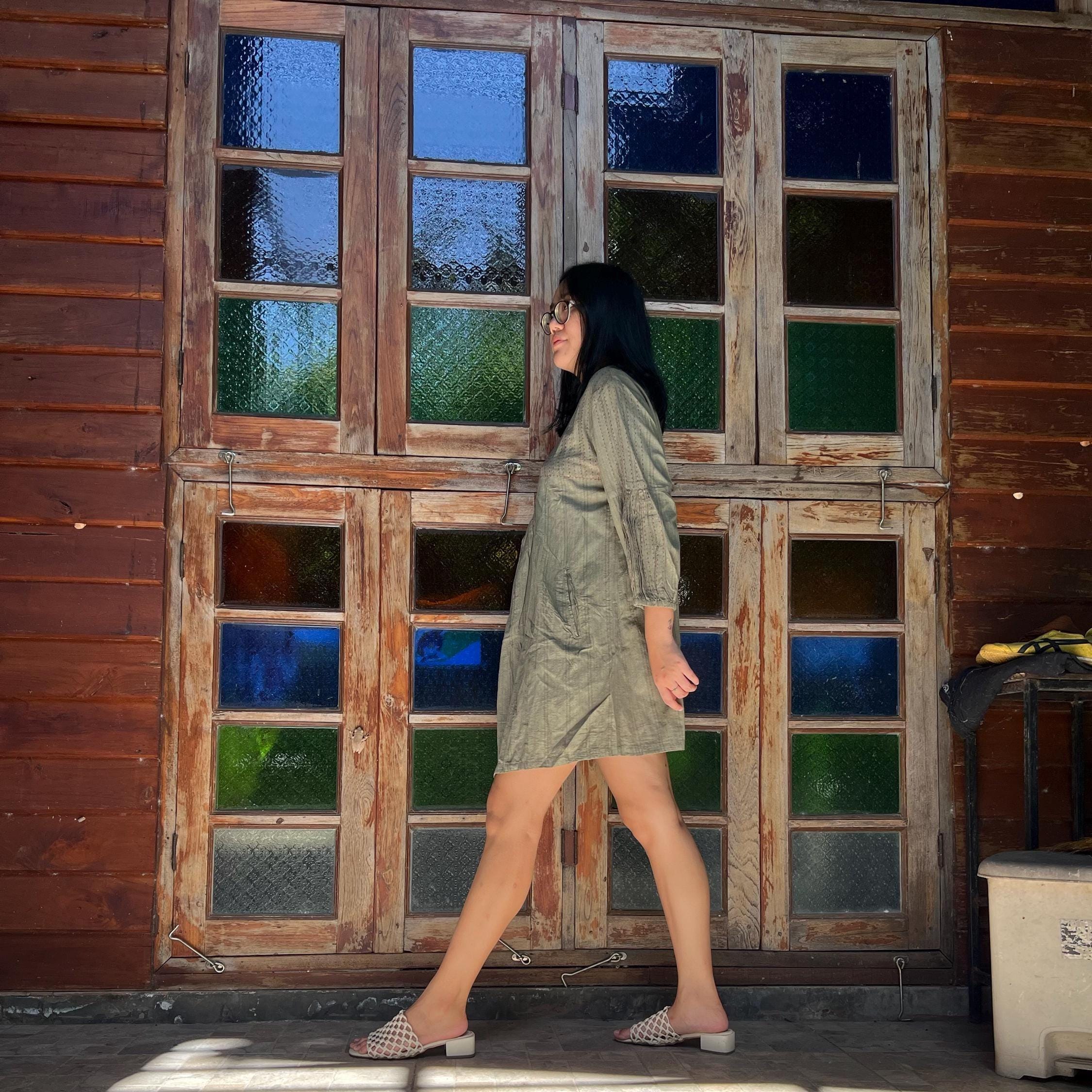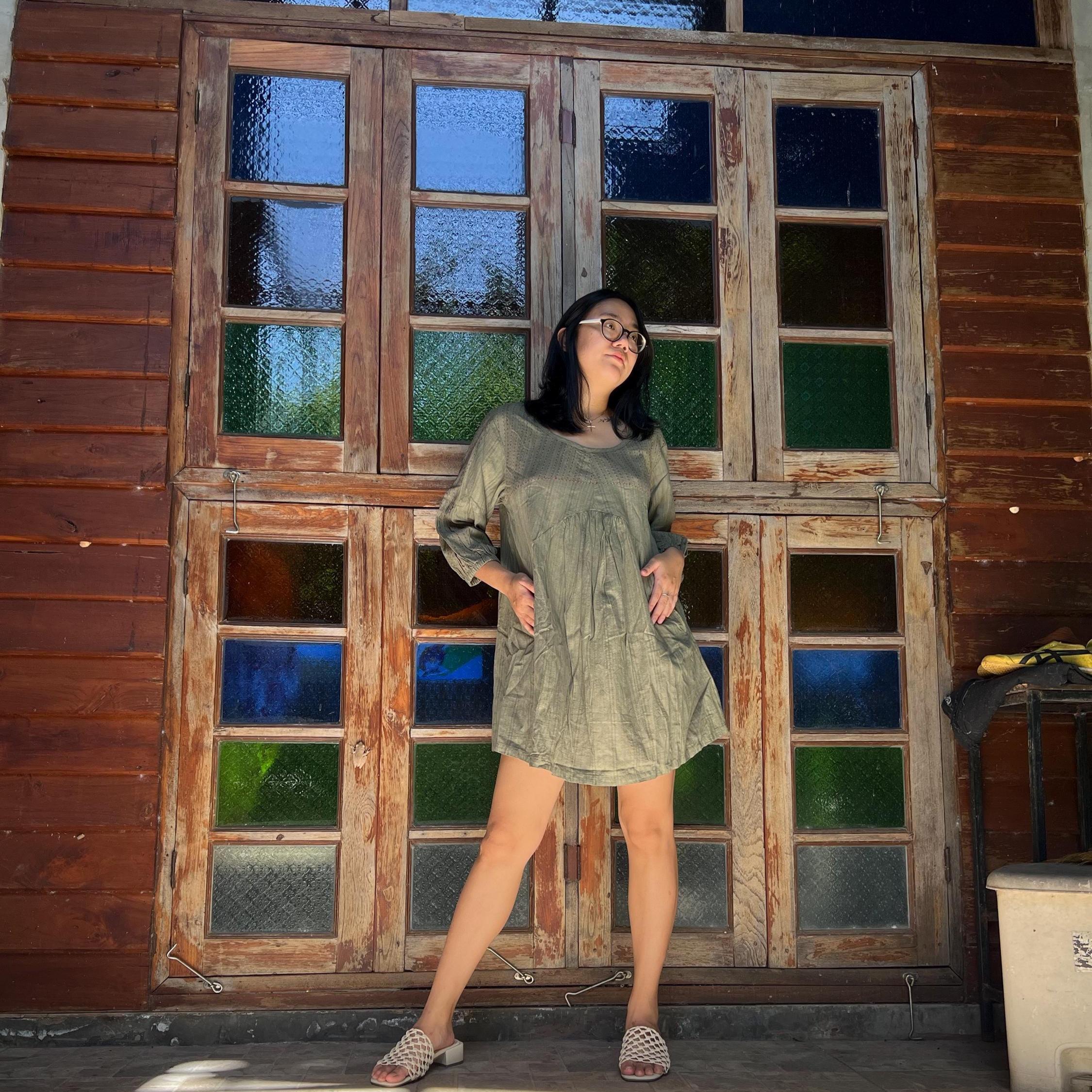 Round neck. A shape body part with gathers empire waist style. 2 front pockets. The pattern of the dress is simple yet very flattering.