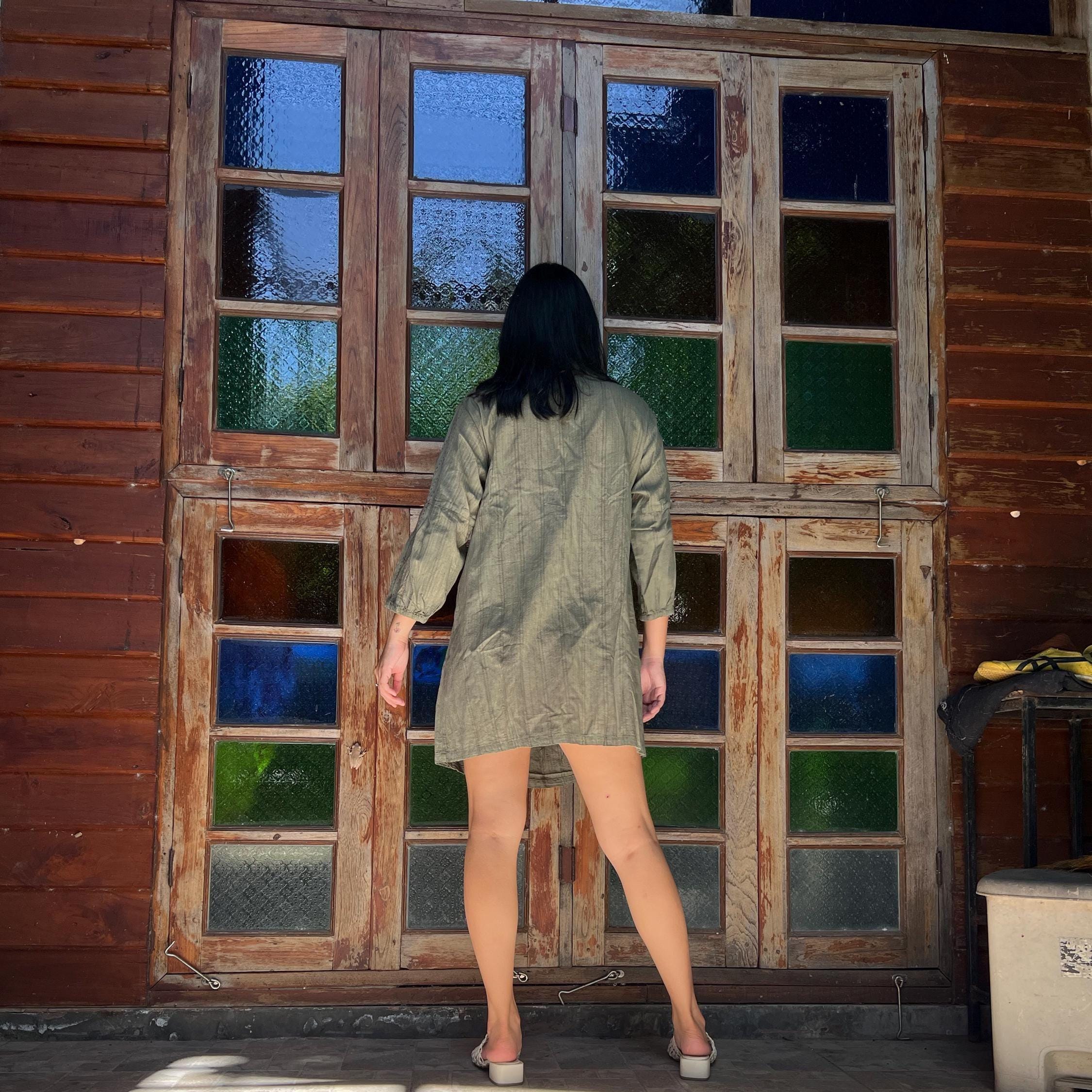 Cotton Mini Dress Tunic, Hand-Stitched Detail, Empire Waist