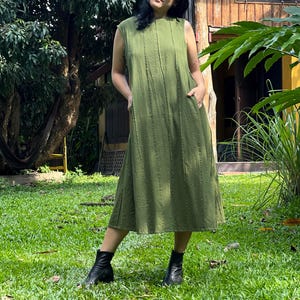 A sleeveless dress with twisted strap. Racer back. 'A' shaped body part with gathers on the bottom to create volume. The dress gathers in pleats underneath which creates a balloon effect. The balloon part can be turned in and function as a pocket! Loose hem on the sides.