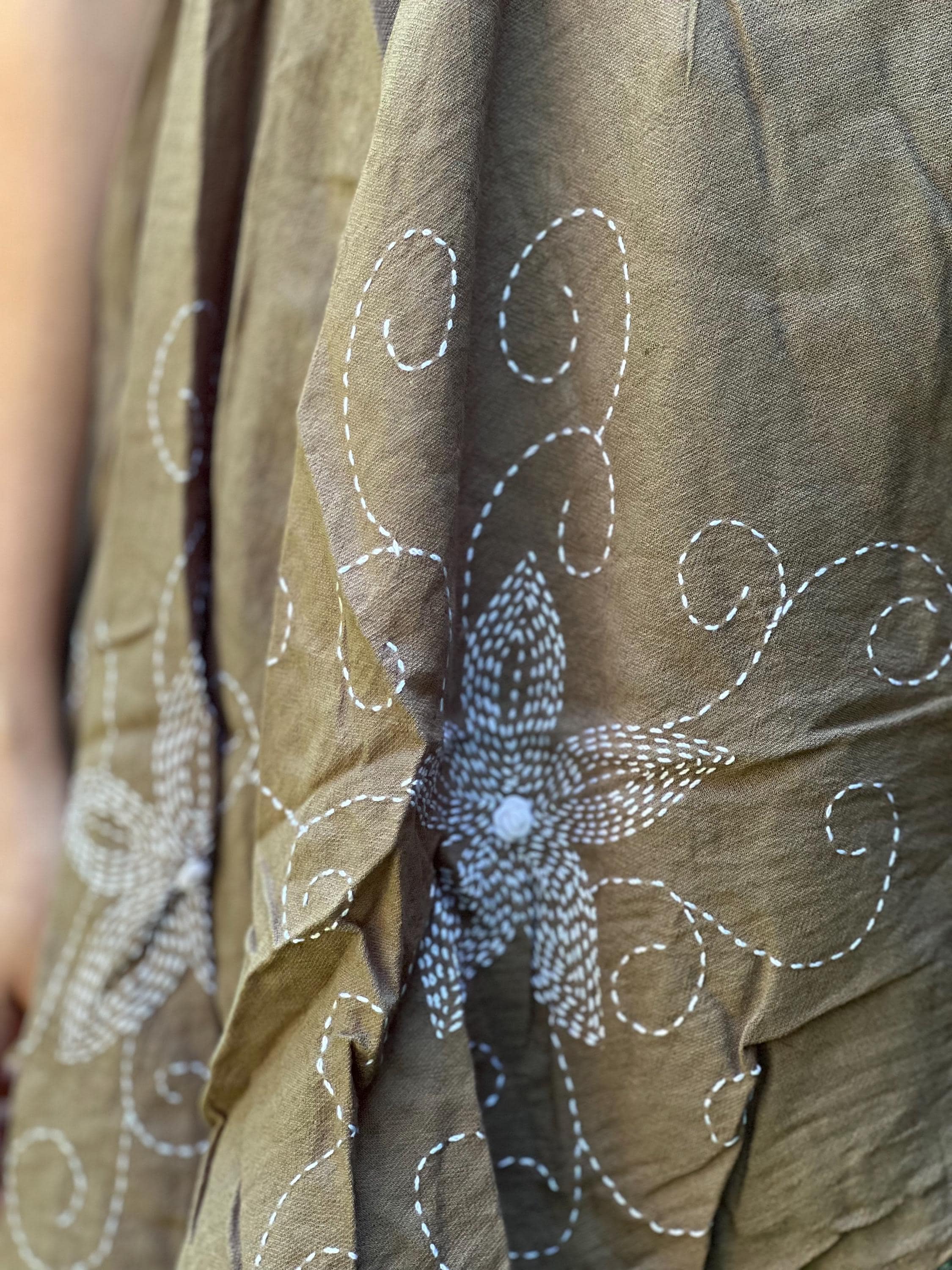Special with hand-embroidery of flowers and vines on the skirt part back and front in the same color as the dress.