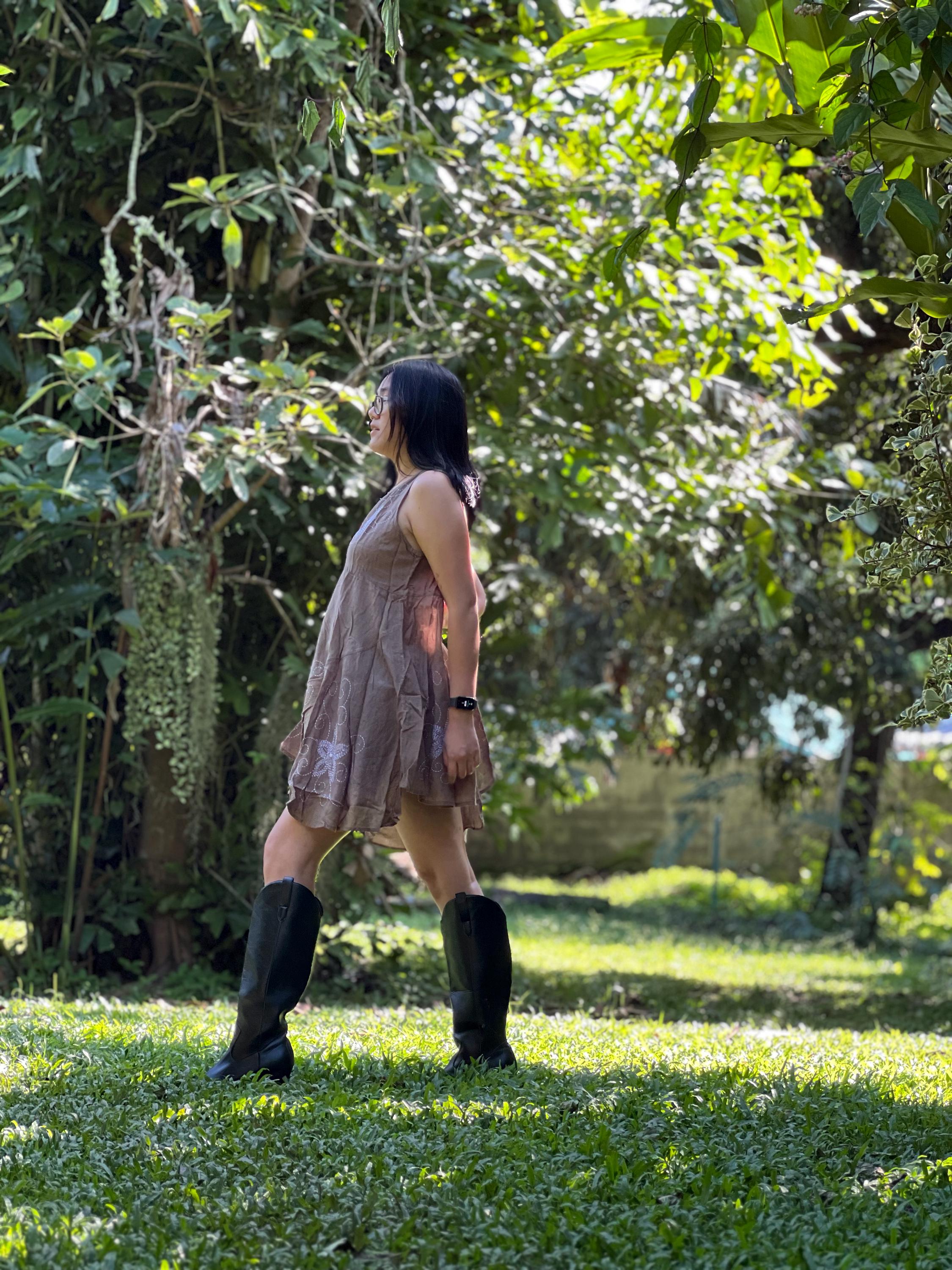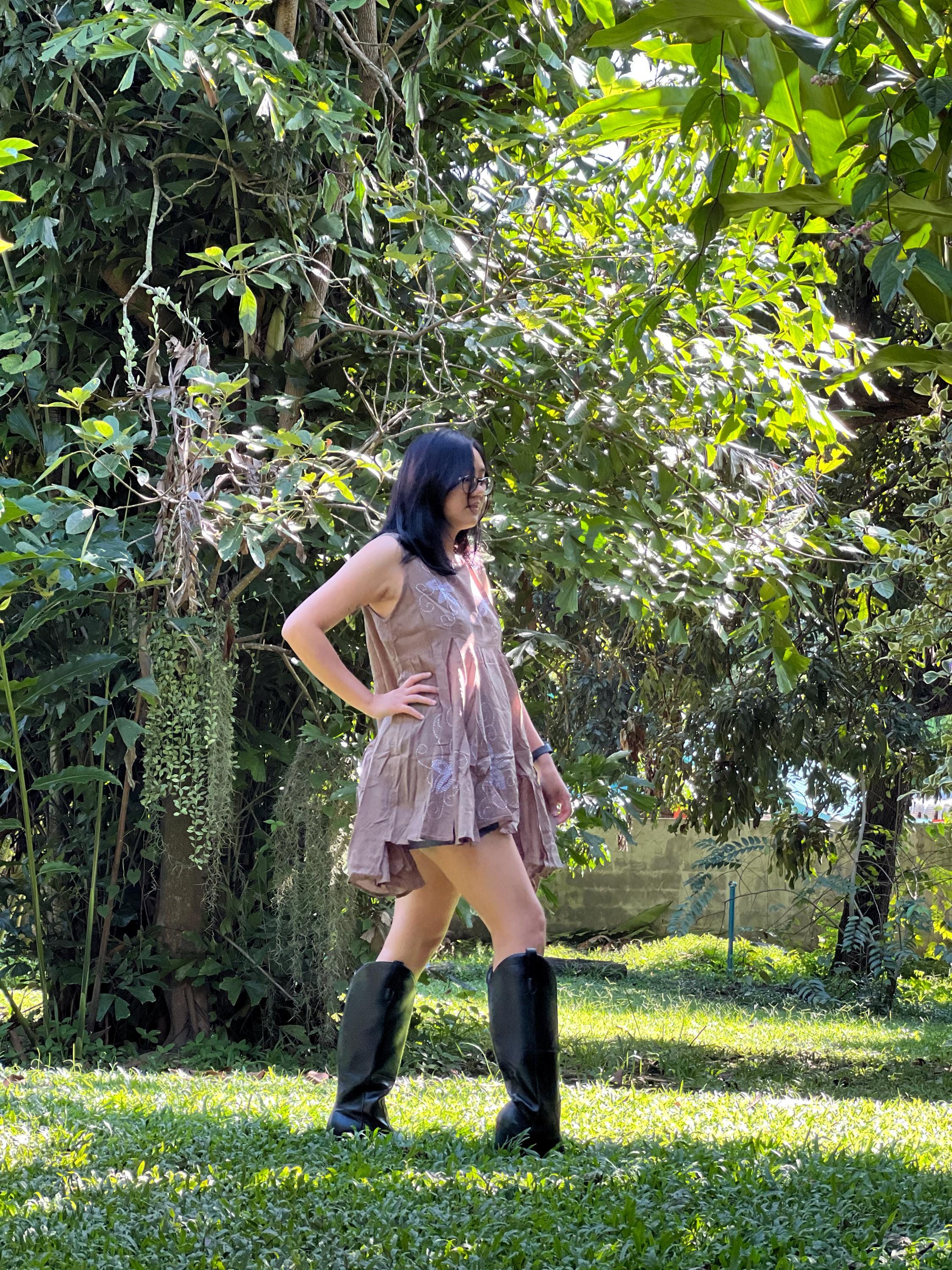 Patched on the bottom part with lots of "cut on a bias" fabric. It consumed about double of the normal cut, though it flows beautifully in full circle. Uneven hem both back and front.